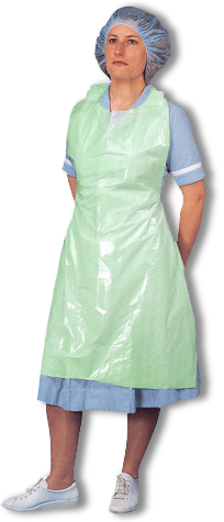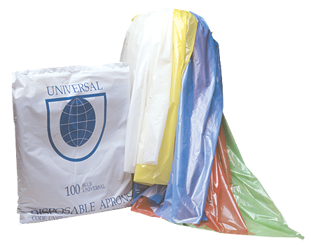 Polythene aprons in red, blue and white (also in yellow and green to special order)