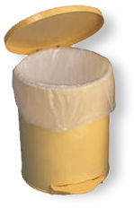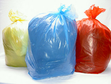 Coloured waste sacks for clinical waste and colour coded waste management regimes (red, blue, green, yellow) and tiger bags for feminine sanitary waste